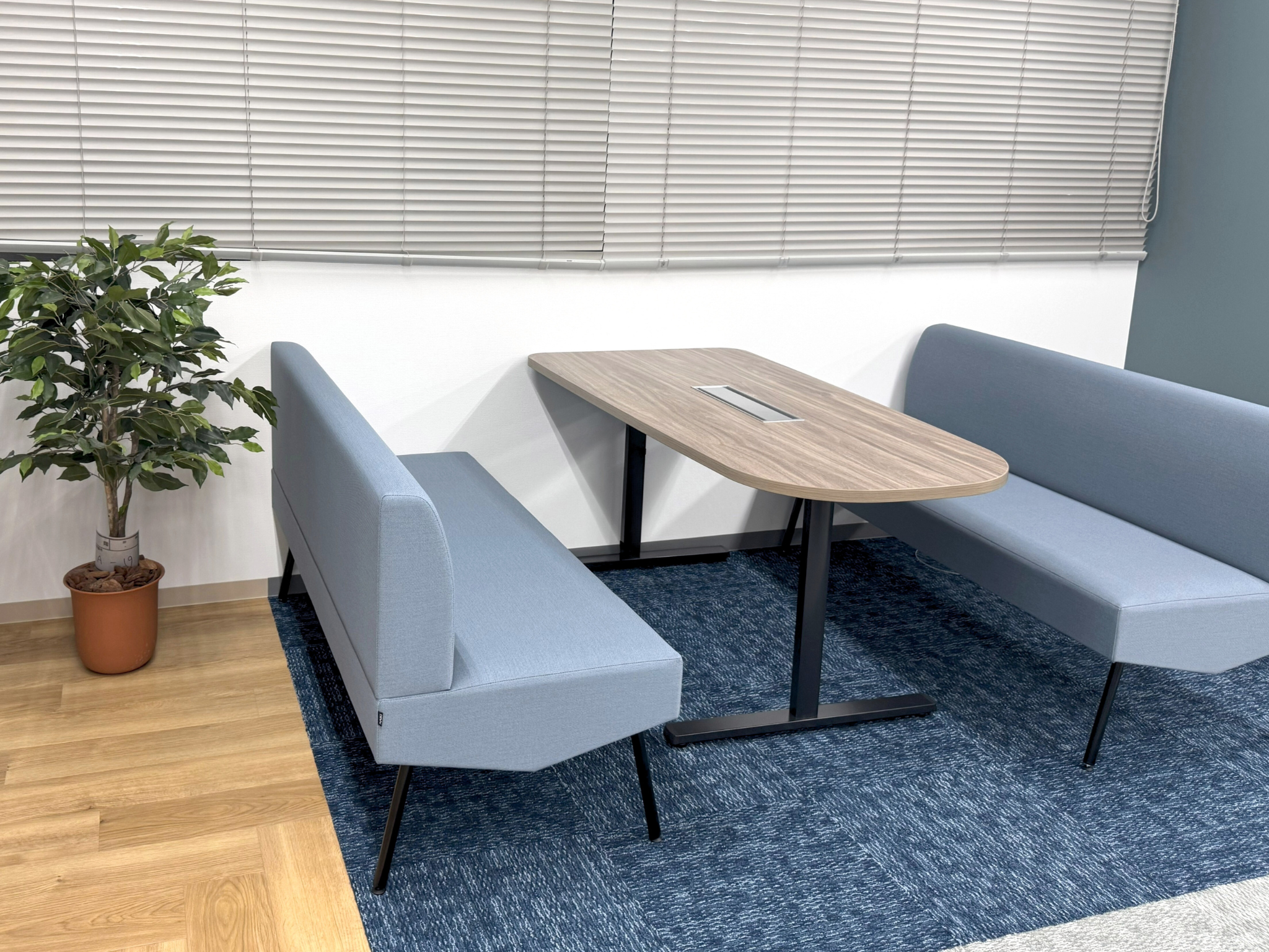 観葉植物が心地よいアクセントになり、リラックスした雰囲気の中で社員が自由にアイデアを出し合い、創造性を育む場として機能します。