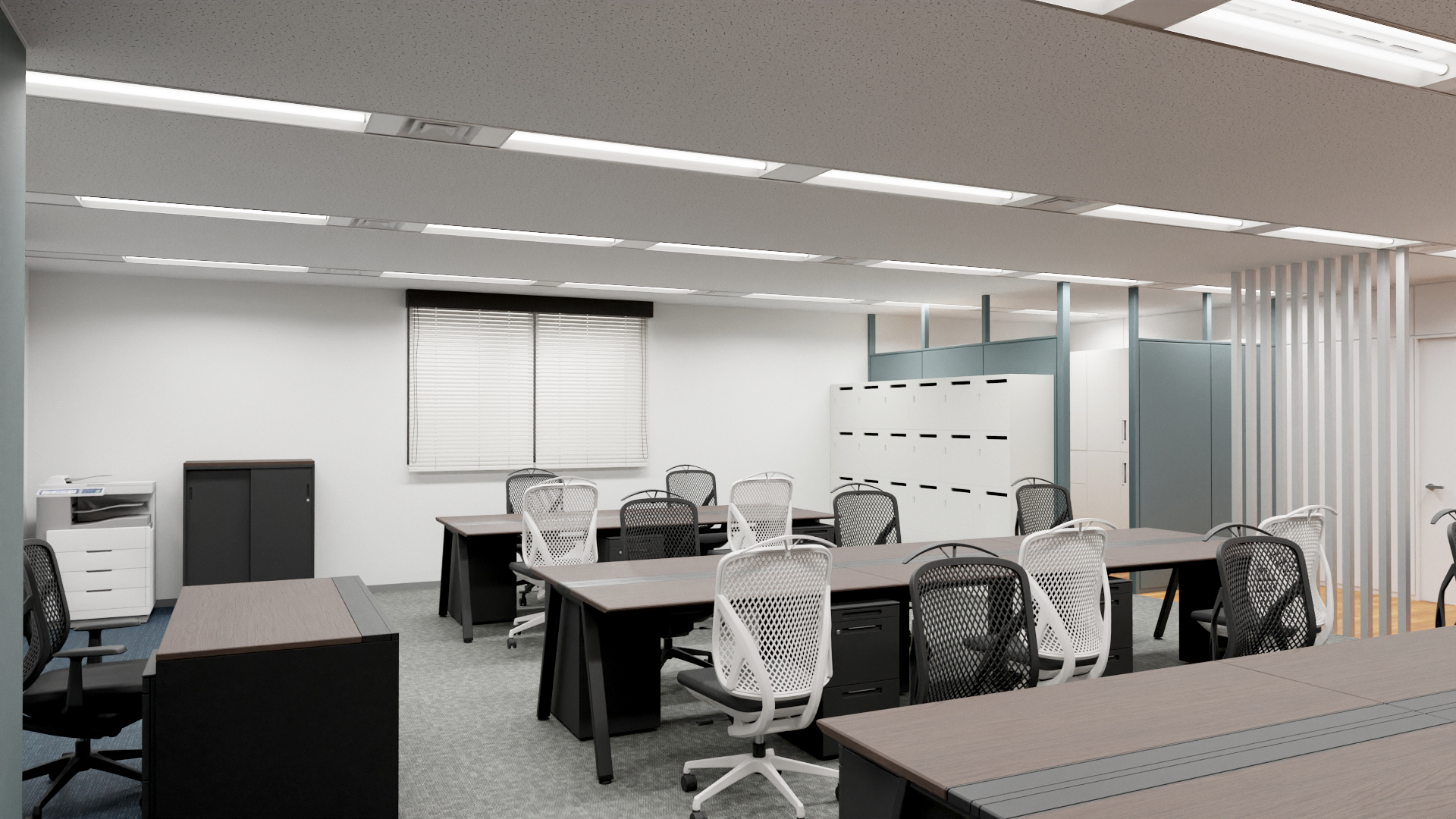 固定席に縛られない働き方を可能にするため、収納効率とデザイン性を兼ね備えた白色のロッカーとスモーキーブルーのパーティションが空間を緩やかに区切り、圧迫感を軽減しました。