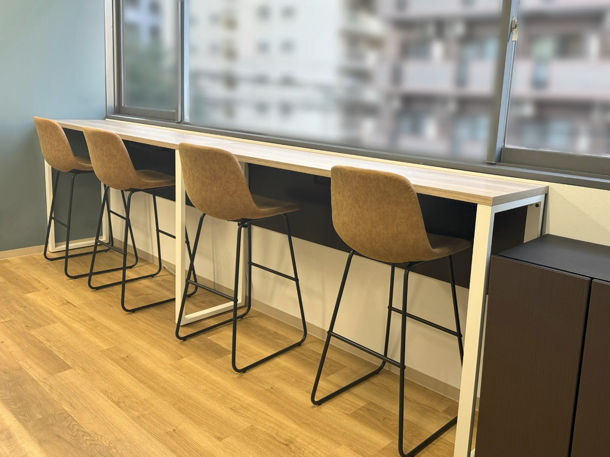 窓際にカウンターテーブルとチェアを設置し、自然光と外の景色を眺めながら休憩や気分転換ができるようにしました。