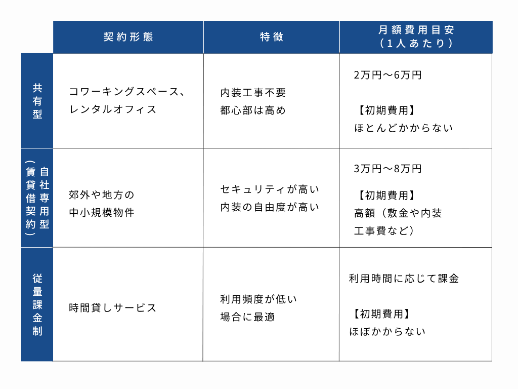 コストを抑えるには内装工事費が発生しない共有型(コワーキングスペース)の利用を検討するか、自社専用型を選ぶ場合は内装が整った居抜き物件を選ぶことが有効です。
