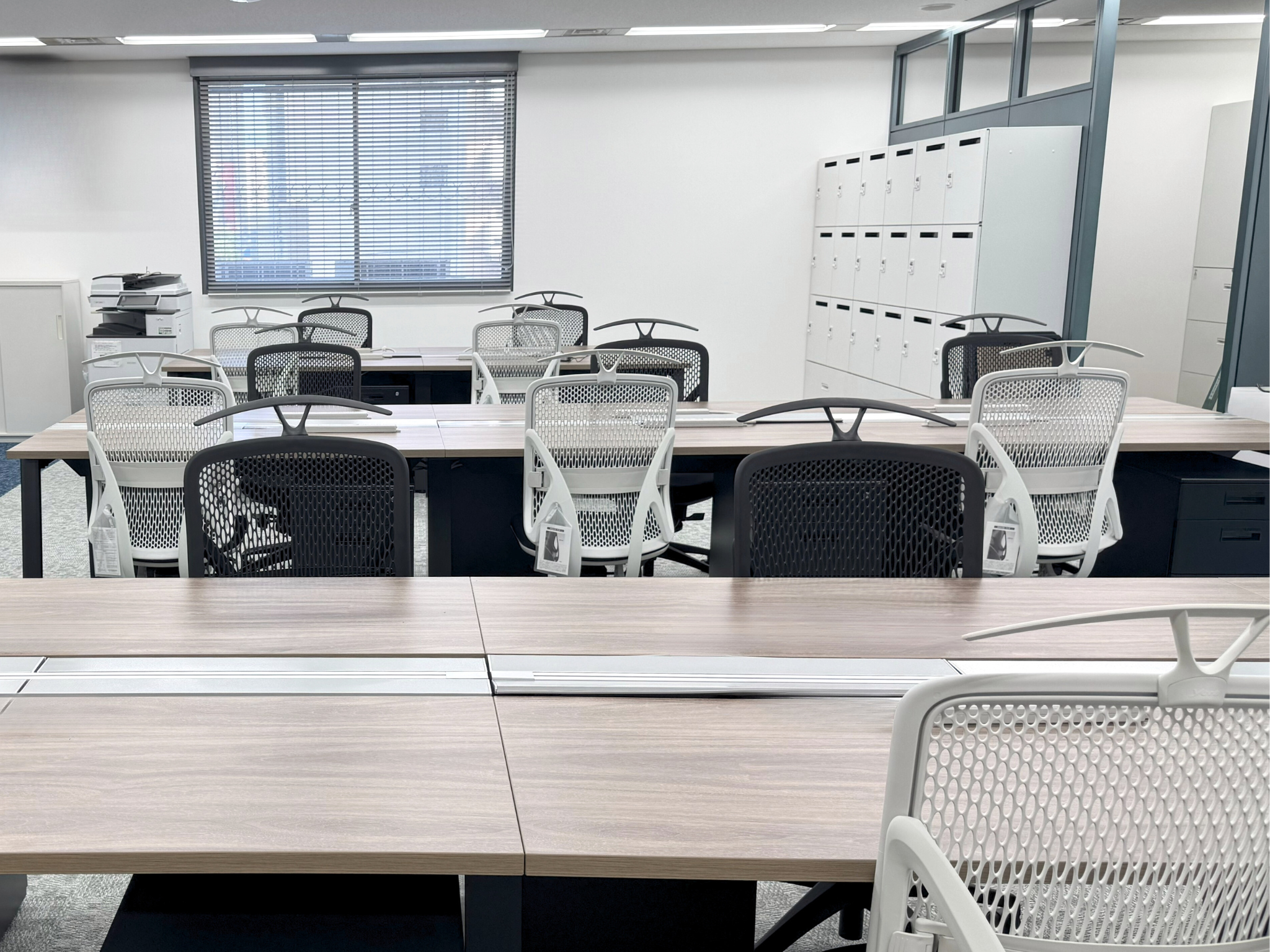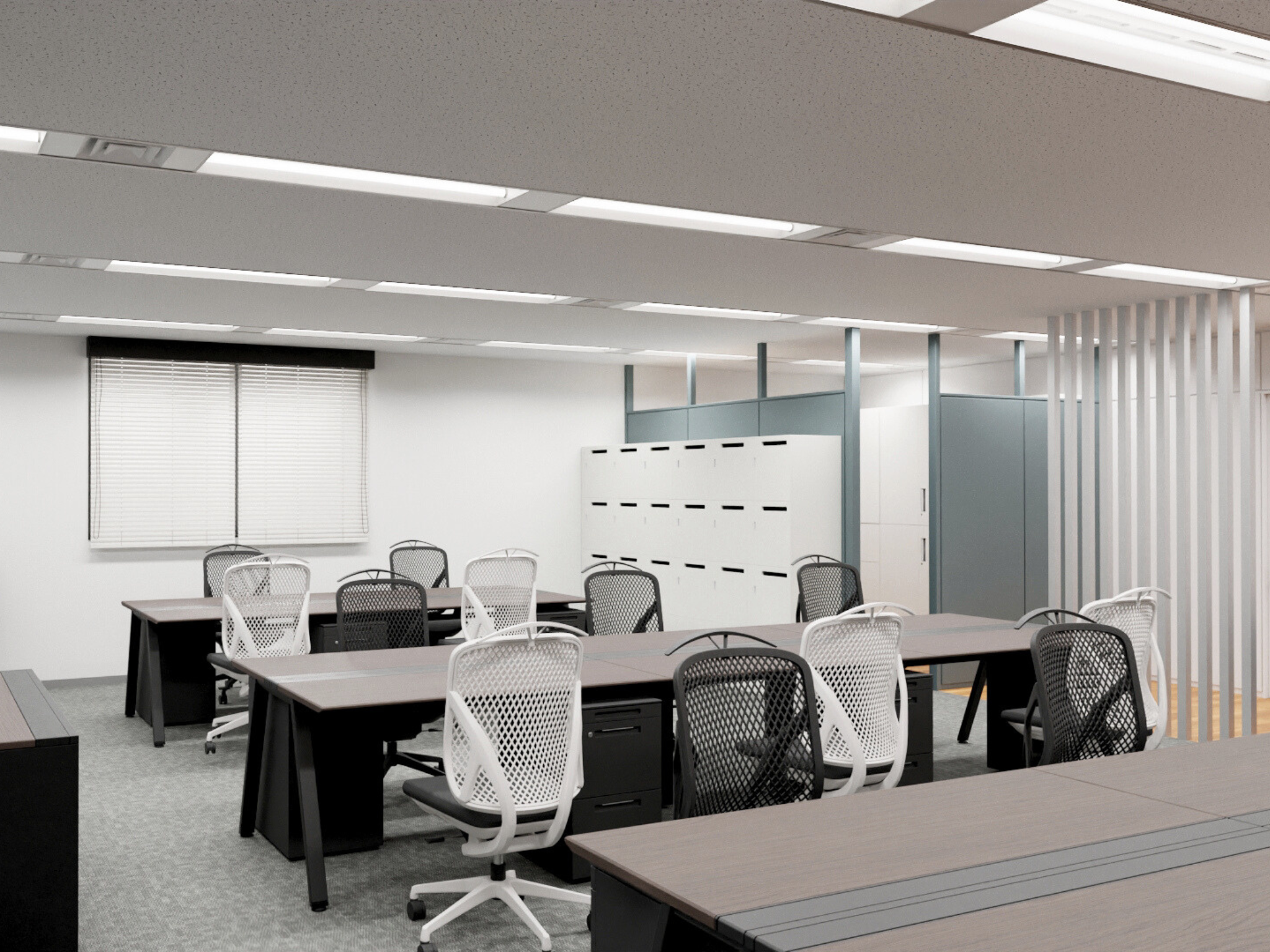 固定席に縛られない働き方を可能にするため、収納効率とデザイン性を兼ね備えた白色のロッカーとスモーキーブルーのパーティションが空間を緩やかに区切り、圧迫感を軽減しました。