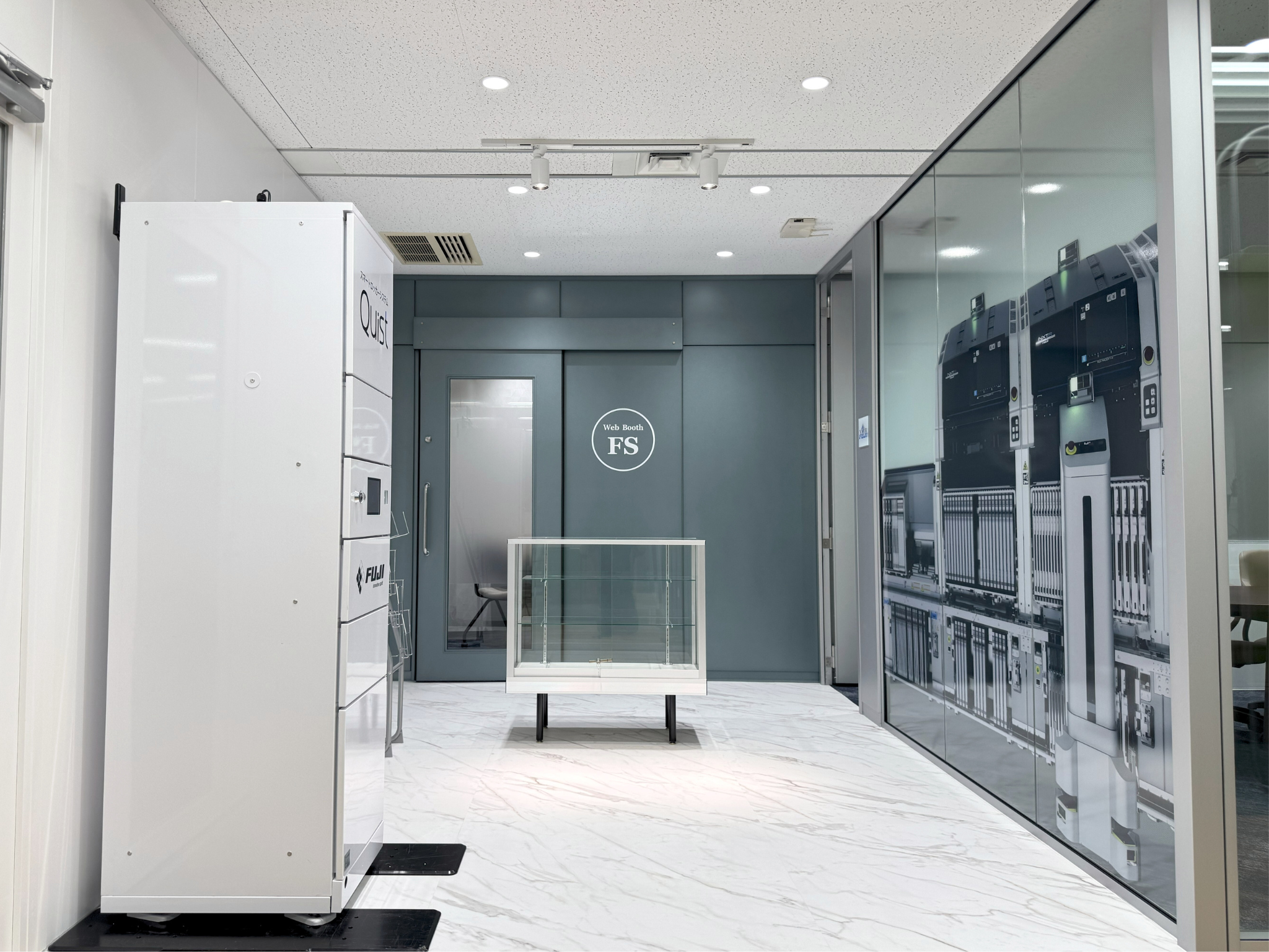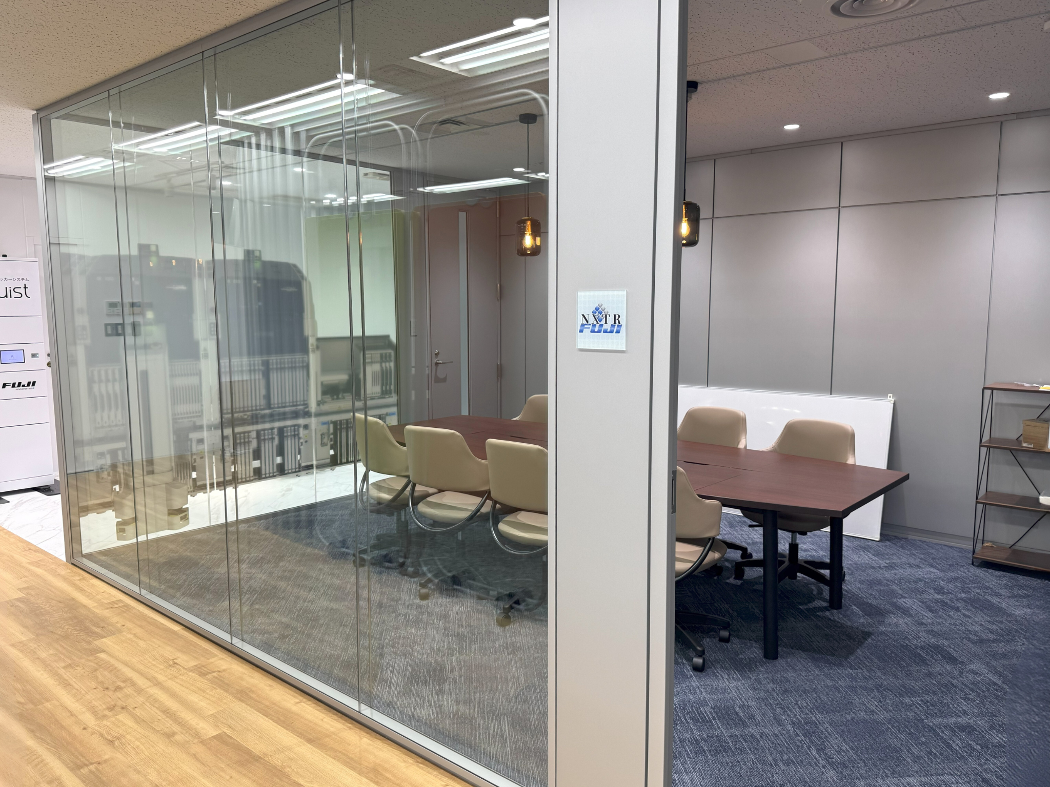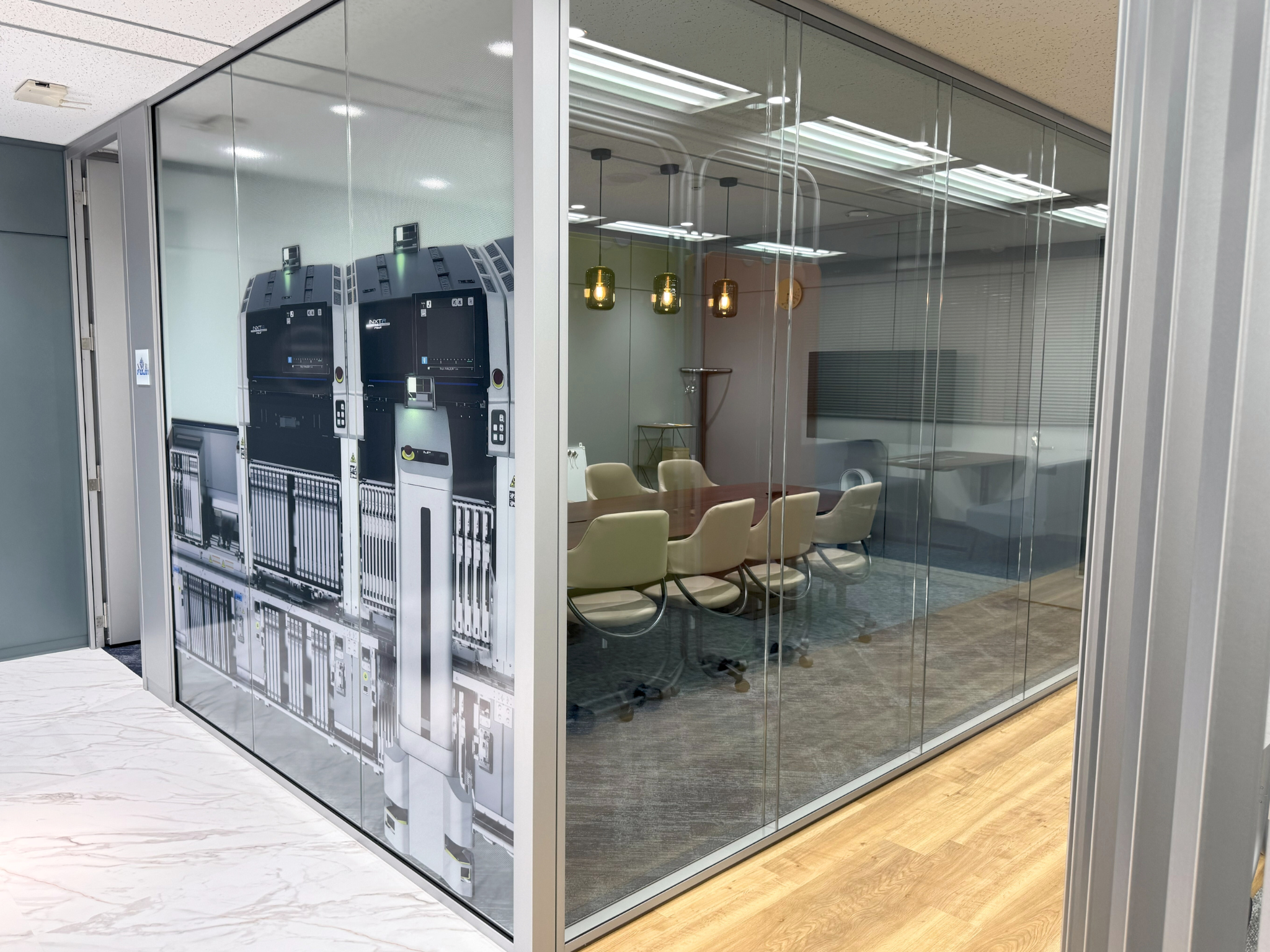 ガラスのパーティションには株式会社FUJI様の電子部品実装機や工作機械をイメージさせるグラフィックデザインを施し、来訪者に強いインパクトを与えます。