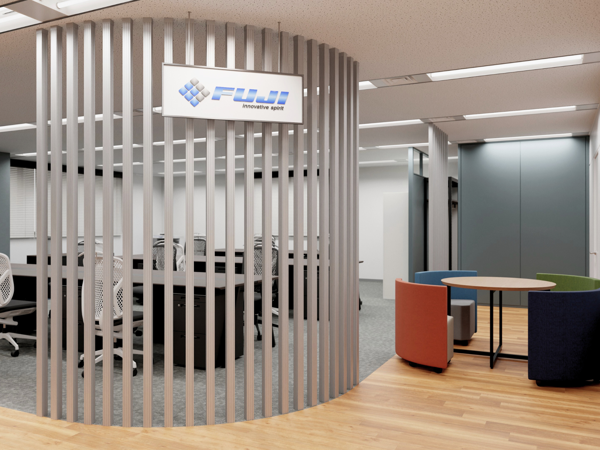 電子部品実装機や工作機械の開発・製造・販売を手掛ける株式会社FUJI 大阪支店様において、この度新たなワークプレイスの実現をサポートさせていただきました。企業の先進的な技術力と精密なものづくりの精神をオフィス空間全体で表現することをコンセプトに、機能性とデザイン性の両立を追求しました。Web会議の増加や多様な働き方に対応できるよう、柔軟なミーティングスペースと執務エリアを配置。企業の技術力を来訪者に伝える洗練されたエントランス、従業員一人ひとりのパフォーマンスを最大化する多機能な執務エリア、そして社員間の創造的な対話を促す快適なリフレッシュスペースを創出しました。